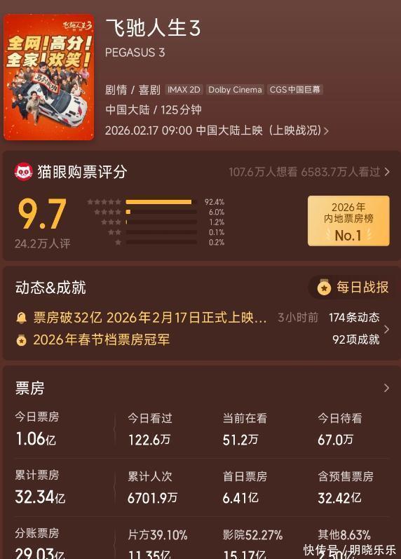 谁说春节档的胜负已分?我看《飞驰人生 3》这匹黑马才刚跑出最漂亮的弯道!眼下票房虽已冲破 32 亿,平台预估能摸到 43 亿的门槛,但在我眼里,这数字简直太保守了。冲着那股子不服输的劲儿,冲击 50 亿大关完全有戏,毕竟这片子的野心可不止于逗乐大家。