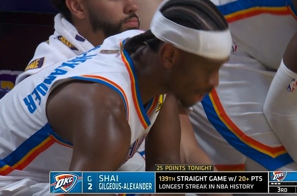 股票配资知识网 打卡下班!亚历山大连续139场20+继续刷新纪录 雷霆领先湖人30+